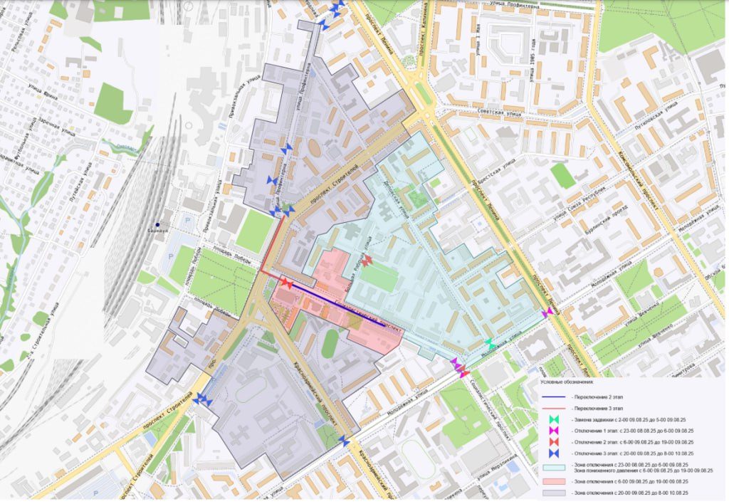 Специалисты «Росводоканал Барнаул» и подрядной организации ООО СМК “ВиКС” выполнят комплекс работ, включающий остановку и опорожнение водопроводов диаметром от 150 до 400 мм, замену задвижки диаметром 200 мм, а также переврезку трубопроводов на проспекте Социалистическом 113, 117, 119а, 128 и площади Победы, 2.