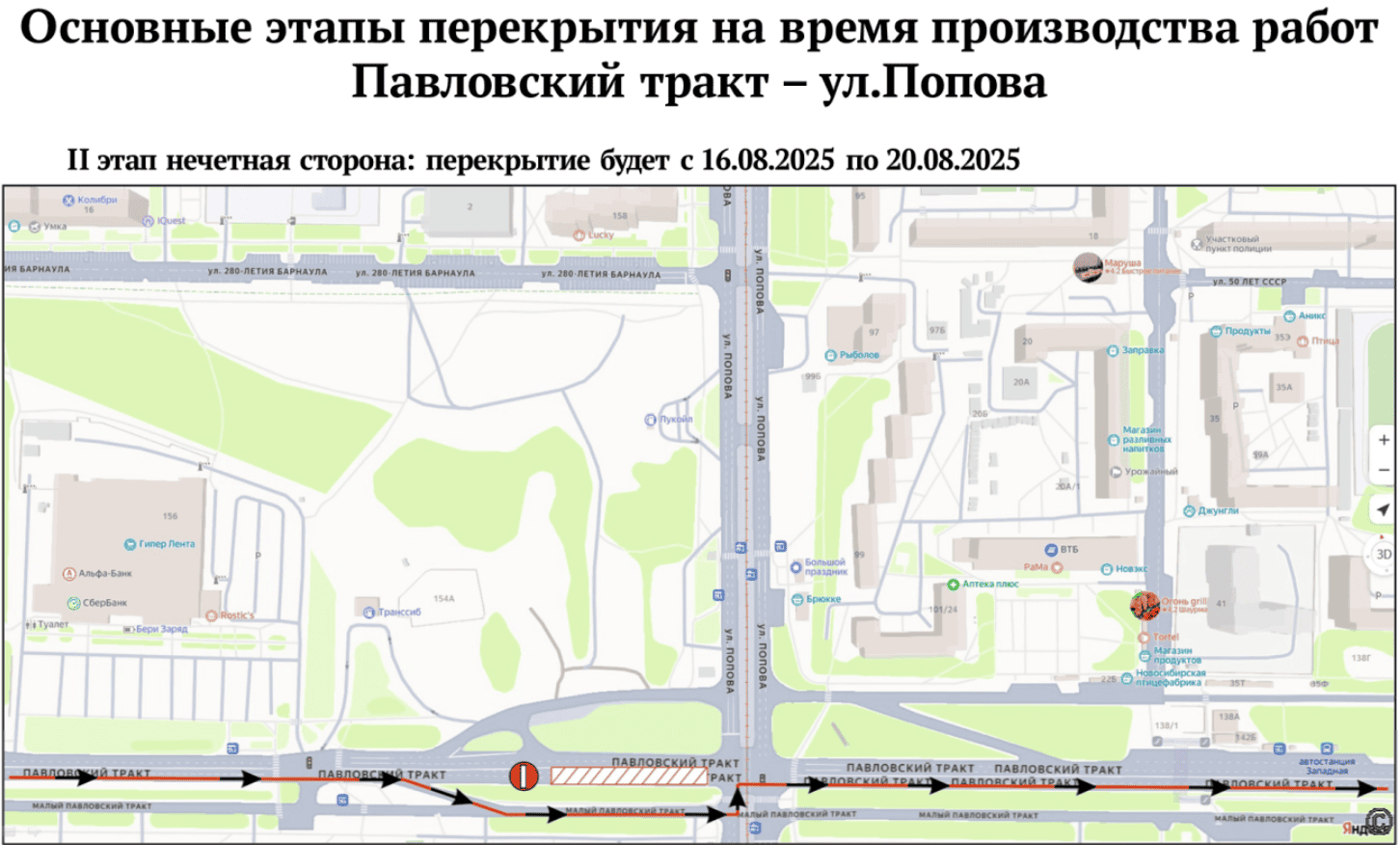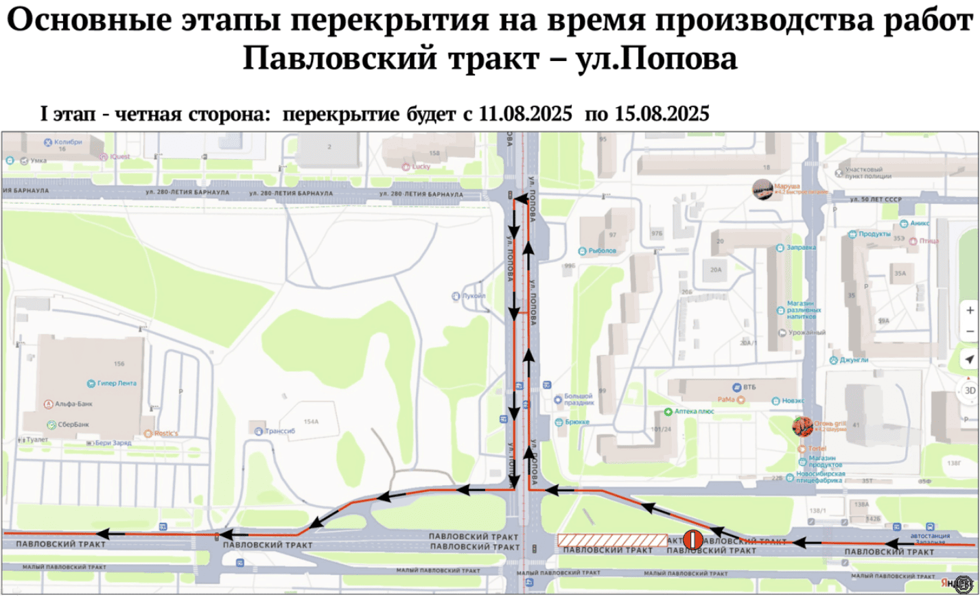 Ограничение движения будет проводиться поэтапно. С 11 по 20 августа полностью закроют пересечение Павловского тракта с улицей Попова. С 11 по 15 августа перекроют четную сторону магистрали, а с 16 по 20 августа — нечетную сторону. С 1 по 10 сентября введут ограничения движения по отдельным полосам на участке у улицы Солнечная Поляна.