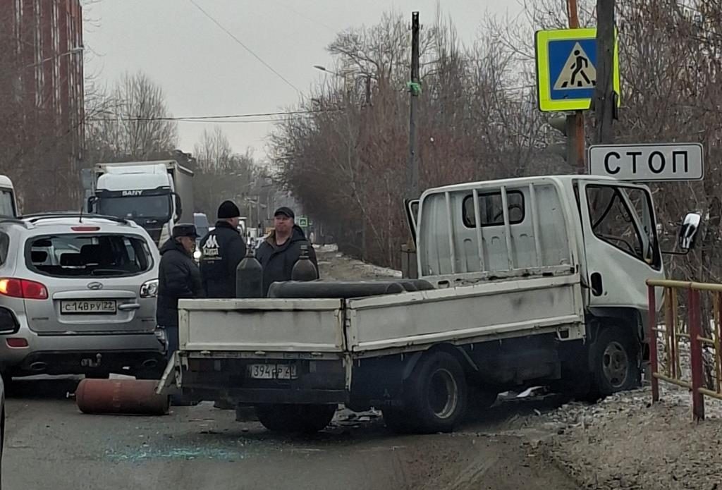В ДТП участвовало два транспортных средства: легковой автомобиль и небольшой грузовик, перевозивший газовые баллоны. В результате ДТП грузовик оказался на обочине, частично за пределами проезжей части, что может свидетельствовать о резком манёвре при попытке избежать столкновения на скользкой дороге.