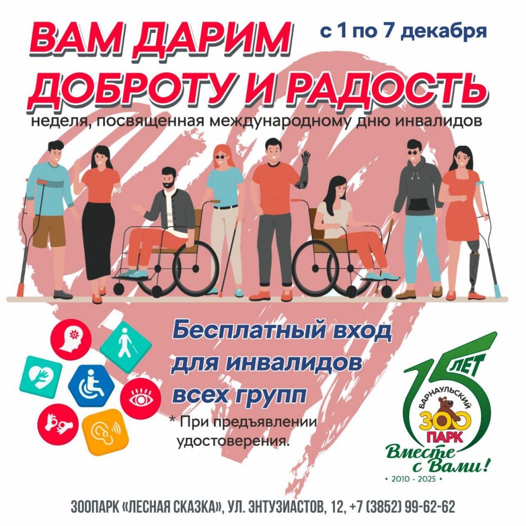 С 1 по 7 декабря в барнаульском зоопарке «Лесная сказка» пройдет акция, приуроченная к Международному дню инвалидов. Посетители с инвалидностью любой группы смогут посетить зоопарк бесплатно при предъявлении соответствующего удостоверения.