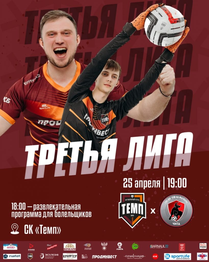 Долгожданное событие для всех, кто следит за командой, наконец наступает. Футбольный клуб «Темп» начинает свой шестой сезон в Третьей лиге. Приглашаем болельщиков на матч-открытие, который состоится в эту субботу, 25 апреля. Соперник — команда «Чита». Игра пройдет на домашнем стадионе клуба, и поддержка зрителей в этот вечер особенно важна.